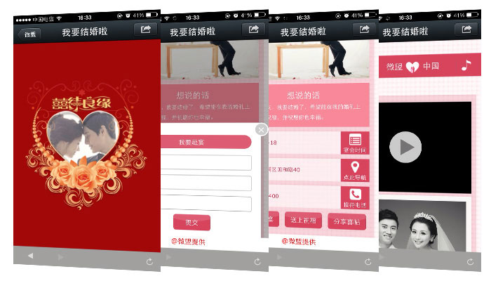 新人可通過微喜帖向親朋好友告知結(jié)婚消息、時(shí)間、地址等,同時(shí)支持微信在線提交赴會(huì)消息、婚禮祝福,并可一鍵分享喜帖到自己的朋友圈,幫助婚慶商家進(jìn)行免費(fèi)的品牌推廣。